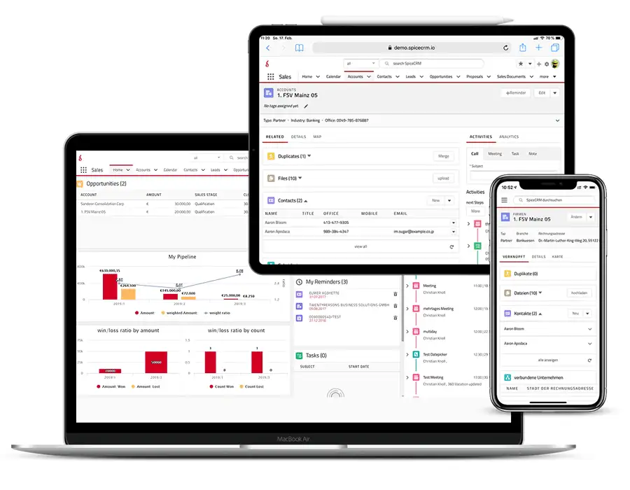 SpiceCRM biedt 360 graden accountmanagement: alle klantgegevens, interacties, activiteiten, documenten, notities en communicatiegeschiedenis op één centrale, altijd actuele plek voor een volledig en helder beeld van elke klantrelatie.